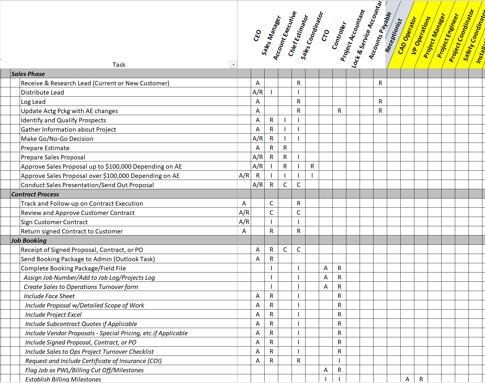 The Goal of the RACI Workshop is to define and document the specific involvement of internal and external stakeholders in each task of your project lifecycle—from lead generation through project closeout and service. This eliminates confusion, reduces duplication of effort, and improves accountability.